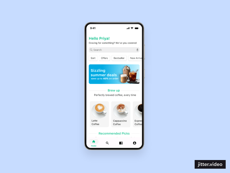 A seamless mobile ordering app for Caffeine Co. Cafe that simplifies browsing the menu, customizing orders, and payment for in-cafe or delivery. Designed around user needs for a streamlined ordering experience.