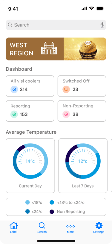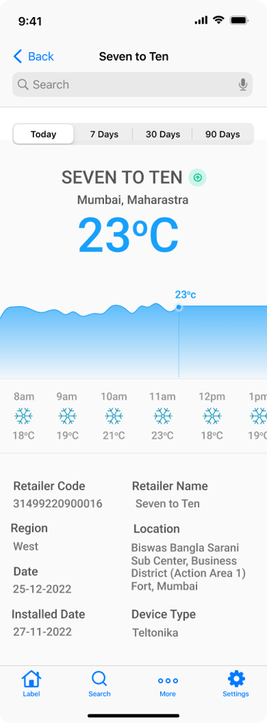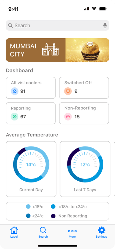 Find finer details on individual stores. Search locations like "shops in Mumbai" to pull up results. Click specific stores to view live status, fridge age, temp history and more. Dive deep into any store's file from install date to real-time operations. Get ground truth from your chocolate front lines.