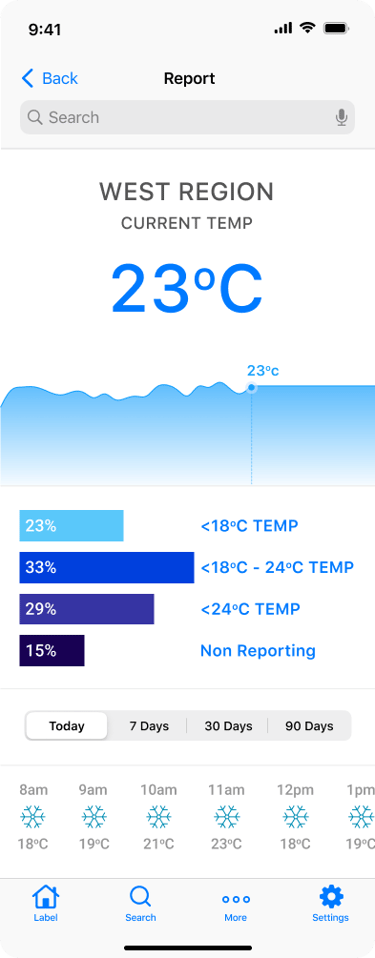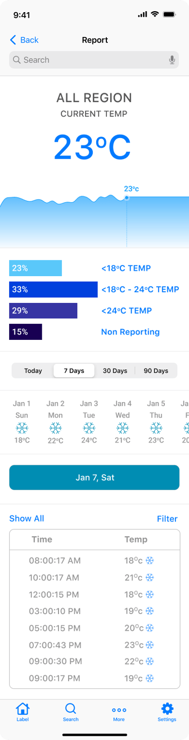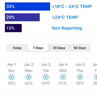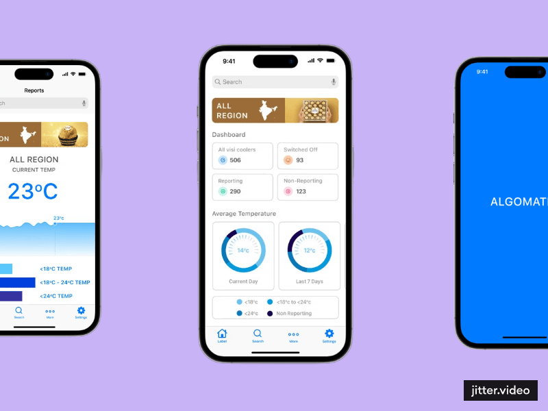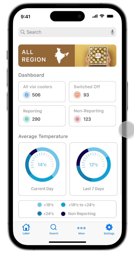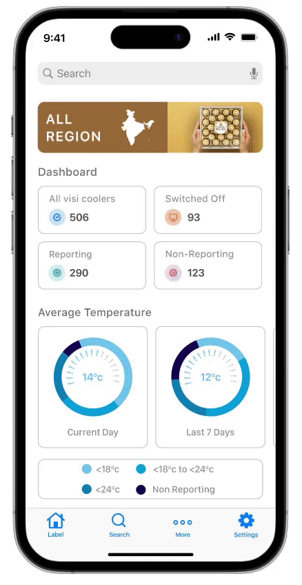 The dashboard offers real-time visibility into active, inactive and off fridge units across India's regions. Temperature data allows monitoring current, 7-day, 30-day and 90-day averages to maintain compliance. Settings enable custom rules, reports and limits to fit your specific chocolate quality needs. Together Algomatix provides the robust, configurable insights required for true 24/7 cold chain command.